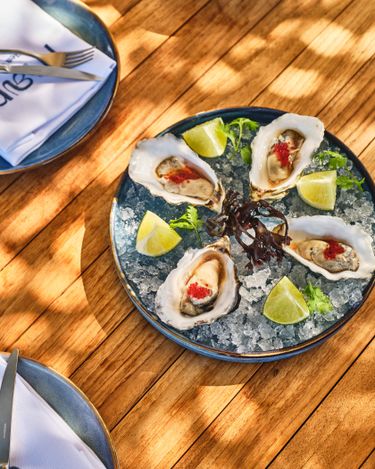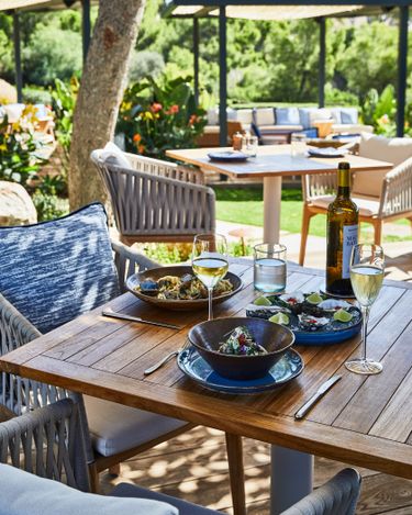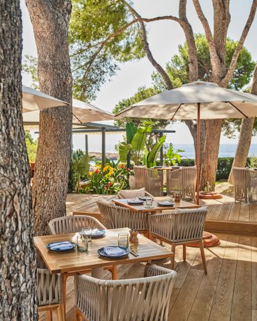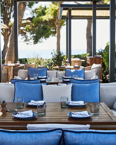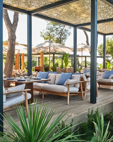 A new & contemporary shoreside bar, modern beach luxe nestled within nature. The perfect lunch spot with spectacular sea views with secluded shaded spaces under the trees and blossom drenched pergolas. A balanced coastal style with contemporary accents, fresh, natural coats, textural - with a food style to match.